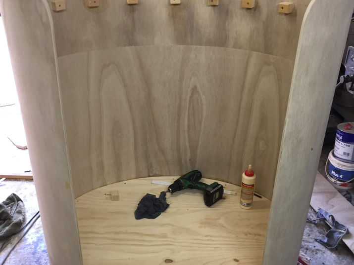 I’d always been intrigued by a product called Bendi-ply and its possibilities so came up with a design utilising its bendability. Gluing two pieces together makes it rigid, I wrapped it around a lovely 18thC chest on stand I happened to have in the workshop and carried out the rest of the curved theme, I finished it with clear shellac for an anonymous subtle finish.