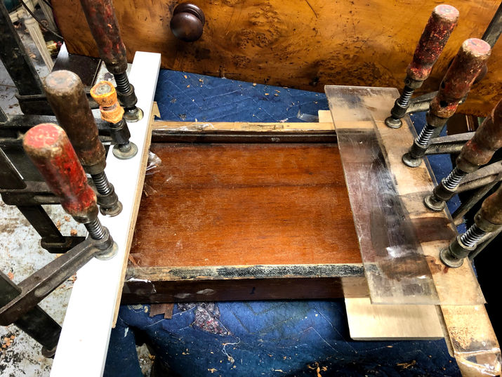 Careful grain-matching of the veneer and a repolish in clear shellac completed the restoration.